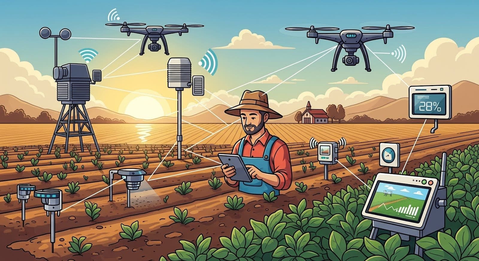 “A network of IoT sensors and devices spread across a farm: soil probes, weather station, drones in the sky, and a farmer checking data on a tablet. Modern yet rural feel, sunrise glow.”