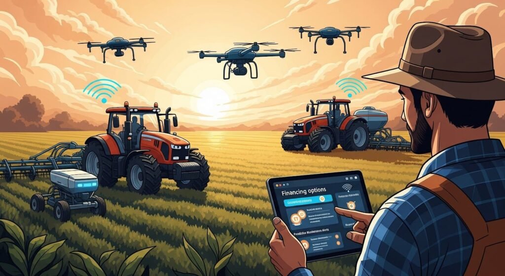“Modern farm scene at sunset with autonomous tractors and drones working alongside leased equipment. In the foreground, a farmer uses a tablet showing financing options and predictive maintenance alerts. The mood combines high‑tech efficiency with agricultural prosperity.”